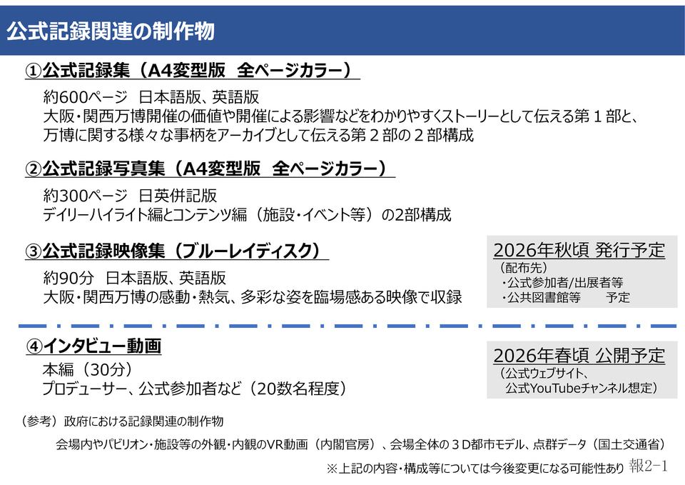 冊子は公式記録集と公式記録写真集、そのほか公式記録映像集を2026年秋ごろ(予定)に発行する。配布先は公式参加者・出展者、公共図書館など。一般販売については言及していない。
