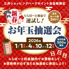 三井不動産商業マネジメントは、全国20施設の「三井ショッピングパーク ららぽーと」で「ららぽーとバーゲン」を開催する。期間は2026年1月1日~12日。対象施設はTOKYO-BAY、柏の葉、豊洲、立川立飛、横浜、海老名、湘南平塚、新三郷(1月1日は休館)、富士見、磐田、沼津、名古屋みなとアクルス、愛知東郷、安城、甲子園、和泉、EXPOCITY、堺、門真、福岡。