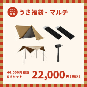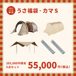 9種類すべて数量限定(一部はすでに完売)。目玉はシェルターテント「ヨンヨンベースTC」、エアマット「ソトネノキワミL」、寝室用小型テント「ワンタッチカンガルーテントS」2点、「テキーラテーブル」の5点がセットになった「うさ福袋-ヨンヨン」。総額14万円相当の豪華セットが4万4000円の特別価格となっている。