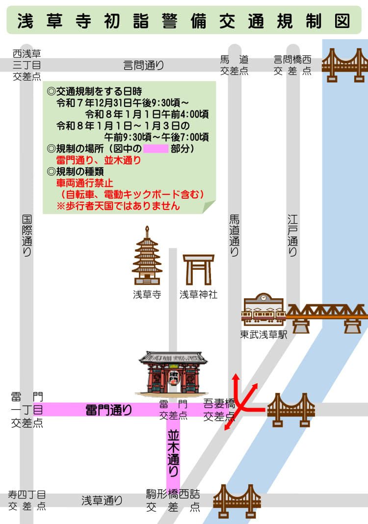 浅草警察署は、浅草寺の初詣にあわせ、大晦日から三が日にかけて雷門通り・並木通りで車両通行止めを実施する。