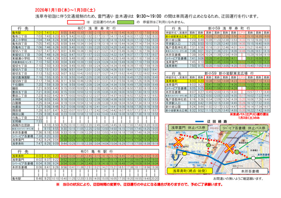 浅草寺初詣、雷門周辺は三が日まで交通規制。雷門通り・並木通り上のバス停は臨時移転