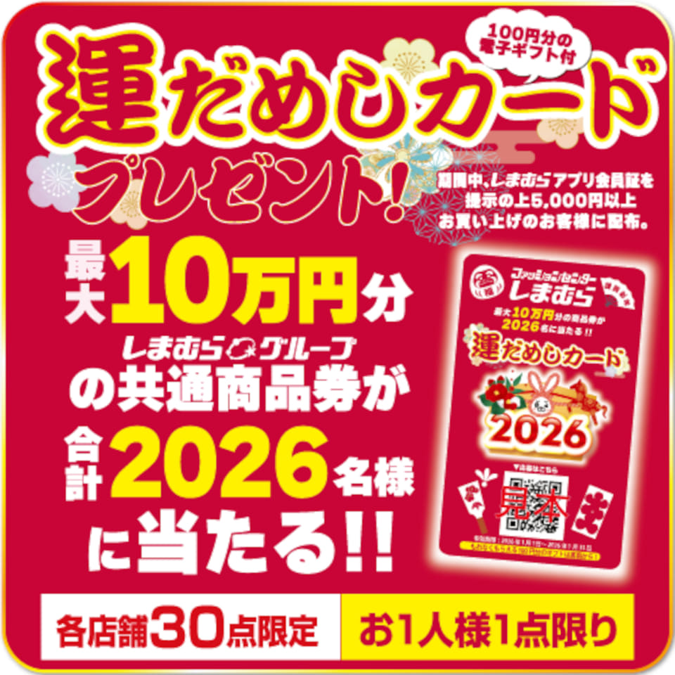 レディース・メンズ・キッズのアウターや肌着、靴下などの衣類・小物を特別価格で販売するほか、お得な福袋を多数ラインアップ。また、ファッションセンターしまむら店舗では、最大10万円分の「しまむらグループ共通商品券」が抽選合計2026名に当たる「運だめしカード」を税込み5000円以上の買い物としまむらアプリ会員証の提示で1枚プレゼントする(なくなり次第終了)。