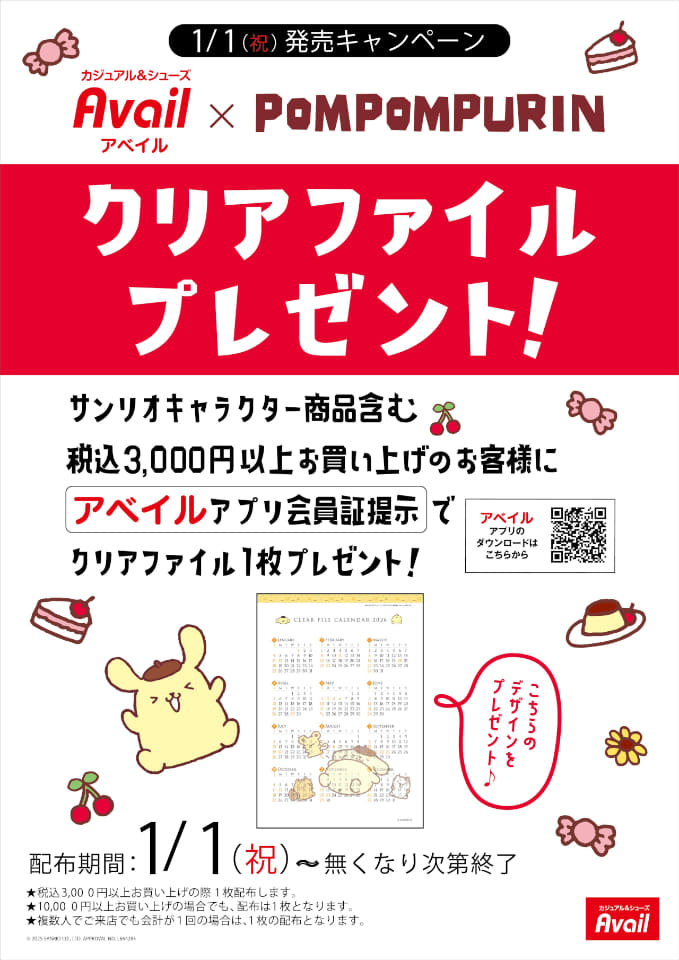 アベイルでは、旬なアイテムを詰めた福袋をはじめ、サンリオキャラクターズ「ポムポムプリン」「マイメロディ」「クロミ」とコラボしたアイテムを販売。また、サンリオ商品を含む税込み3000円以上の店舗買い物とアベイルアプリ会員証の提示で、ポムポムプリンの2026年「カレンダークリアファイル」を1枚プレゼントする(なくなり次第終了)。
