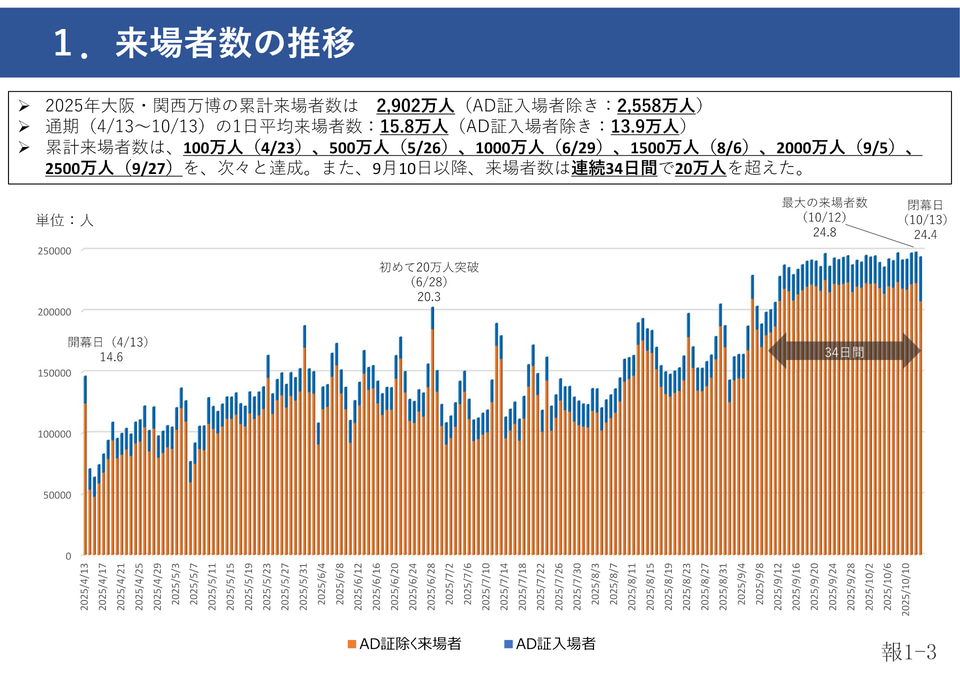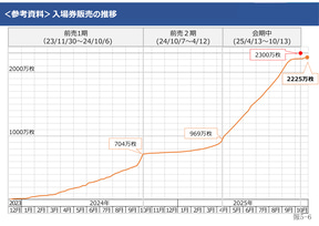 累計来場者数は2902万人(2558万人)、1日あたりの平均来場者数は15.8万人(13.9万人)。最多を記録したのは10月12日の24.8万人(22.3万人)。9月10日以降は連続34日間にわたって来場者数20万人を超えた。