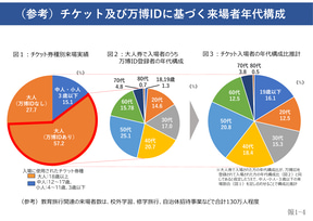 チケット券種別の年代構成は、大人(万博IDあり)が57.2%、大人(万博IDなし)が27.7%、18歳未満(中人・小人・3歳以下)が15.1%。うち、校外学習・修学旅行・自治体招待事業などで訪れたのは合計130万人程度(AD証除く累計の5.1%)としている。