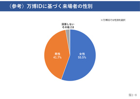 万博IDあり来場者の居住エリア(国内)は、最多の近畿が66.6%、関東16.5%、中部8.8%など。都道府県別の内訳は大阪41.16%、兵庫12.80%、東京7.98%、愛知4.85%、京都4.56%で、男女比は女性が55.5%とやや多い。