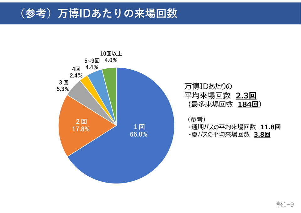 万博IDあたりの平均来場回数は2.3回、最多は会期日数と同じ184回。つまり入場予約などを確保するために複数IDを使い分けることなく、1つのIDで皆勤賞を達成した人がいるようだ。