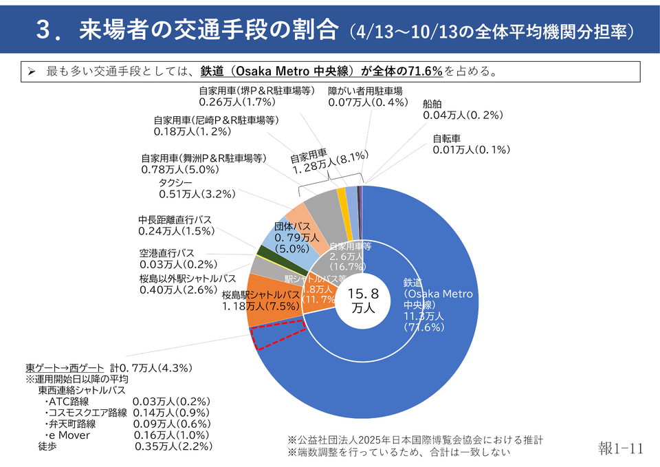 利用した交通手段の割合(4月13日~10月13日の全体平均機関分担率)は、鉄道・大阪メトロ中央線が71.6%、シャトルバスが11.7%、そのほか(団体バス・タクシー・自家用車・船舶・自転車)が16.7%。会期後半は始発タクシー組も増加傾向にあったが、会期全体の平均では3.2%とのこと。
