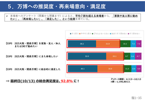 来場者アンケートは、119万801人が回答。「万博をほかの人にもお勧めしたい」「また来場したい」「総合的に満足した」のは平均7割、なかでも最終日(10月13日)の総合満足度は92.8%を記録している。