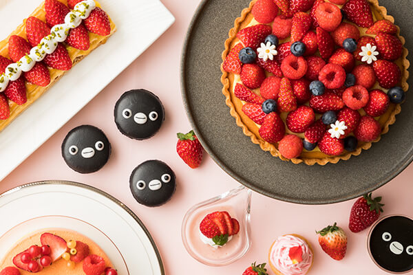 ビュッフェではイチゴをたっぷりと使用した苺のタルト、苺のネイキッドケーキなどホテルメイドの約20種類のスイーツを楽しむことができる。Suicaのペンギンのマカロン、グラススイーツも用意して、普段ケーキショップでも販売していないここだけのSuicaのペンギンスイーツを楽しむことができるという。そのほか、サンドウィッチやスープ、サラダなどの軽食も用意する。