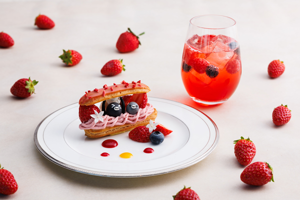 また、1人1つ「Suicaのペンギン 苺のエクレア」の一品スイーツも楽しめる。Suicaのペンギンをサンドしたかわいらしいミニエクレアで、サクサクの生地とストロベリークリームの相性が抜群とのこと。ホテルオリジナルドリンクのストロベリーモクテルも用意している。