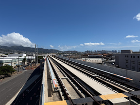 ホノルルを走る鉄道としては75年ぶりに開業した「スカイライン」は、東カポレイからホノルル空港を経由して、ワイキキ市街手前のアラモアナセンターへ至る高架鉄道で、乗員のいない無人の自動運転で営業している。