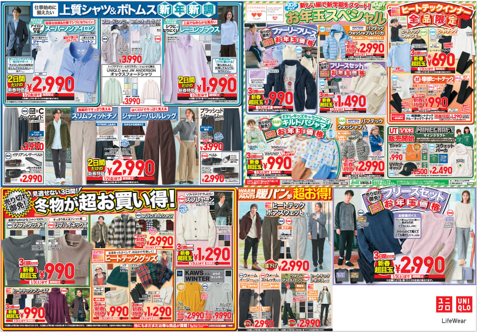 ユニクロは、本日1月1日から始まる「ユニクロ新年祭」のチラシを公開した。ニットやシャツ、ボトムスなど、さまざまなアイテムが新春特価になる8日間の大型セール。