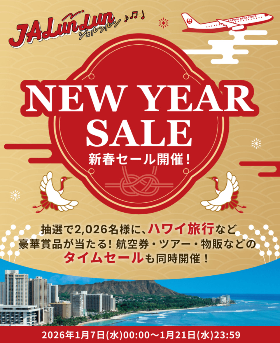 JALは、航空券やツアー、物販がお得な「JALunLun 新春セール 2026」を1月7日0時~21日23時59分に実施する。