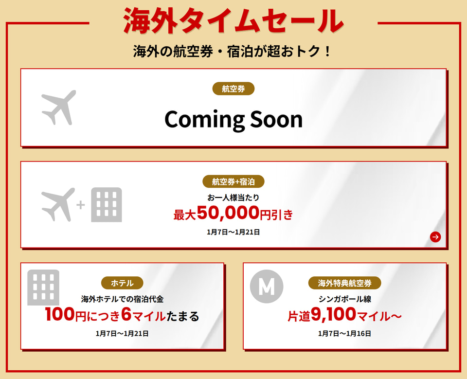 海外では、シンガポール線の特典航空券(片道)が通常1万3000マイル~としているところ、セール期間中は9100マイル~に。航空券やダイナミックパッケージのタイムセールも実施する。