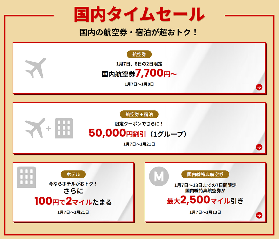 そのほか国内では、航空券+宿泊(ダイナミックパッケージ)が最大5万円引きになるタイムセールをはじめ、国内線航空券や特典航空券、ホテルのセールも実施予定。