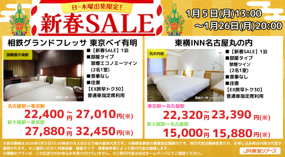 JR東海ツアーズは、新幹線と宿泊がセットになったEX旅パックの「日~木曜出発限定!新春SALE」を1月5日~26日20時に実施する。