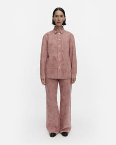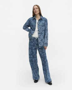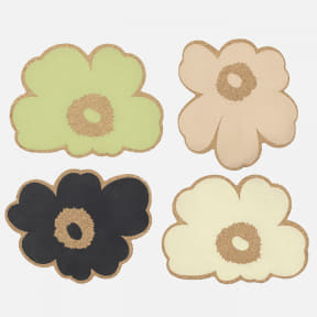 マリデニムでは、ウニッコをあしらったダスティピンクカラーの「デニムシャツ」(6万7100円)や「デニムパンツ」(5万6100円)のセットアップなどを展開。ホームコレクションでは、花が咲くようなウニッコ&キヴェットデザインの「ガラスプレートセット」(4枚1万5400円)、「箸置きセット」(4個9340円)などをラインアップしている。