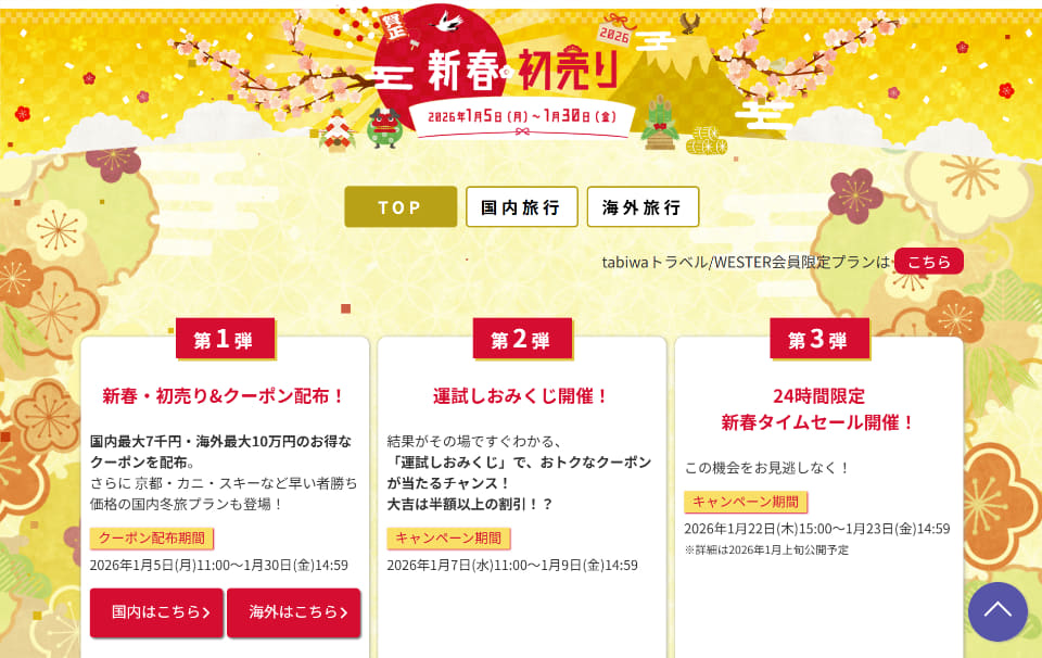 日本旅行は、国内・海外旅行がお得な「新春・初売り2026」を1月30日まで実施している。