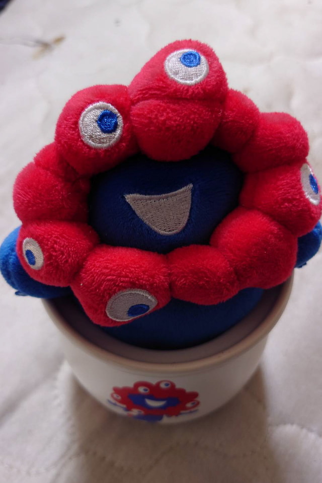 なお、縦長の容器はミャクミャクグッズの保管にもよく使われる。なかには、人気商品「ミャクミャクもっちりぬいぐるみ」をタコ壺型容器にピタッと収めて「壺入りミャクミャク」の記念撮影を行なう人々も多くいた。壺とぬいぐるみの組み合わせ、最初からこのために作ったのでは?と思わせるそのジャストフィットぶり!
