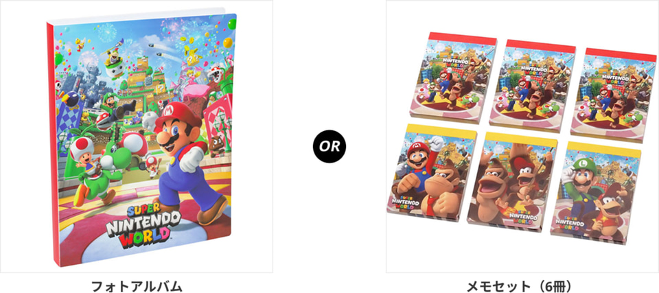 さらに、楽天限定の特典+スタジオ・パス付きプランと楽天限定プランを用意。特典付きプランでは、スーパー・ニンテンドー・ワールドグッズとしてフォトアルバム・メモセット(6冊入り)のいずれかを1予約につき1つプレゼントする。