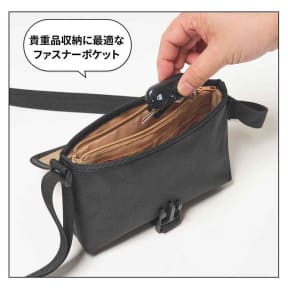 サイズは約21×5×12.5cm(幅×奥行×高さ)で、スマホがすっぽり。お財布スペースにはカード入れやファスナー付きコインポケットが備わり、収納スペース側と区切る中央の仕切りとして、カギなどの貴重品を入れられるファスナーポケットも搭載している。表はブラックでシンプルに、内装は視認性が高いブラウンカラーなのもポイント。