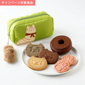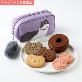 内容: ねこのしっぽチャーム付きポーチに、3種の焼き菓子(ねこの顔型クッキー、肉球型クッキー、バウムクーヘンチョコ)を詰め合わせ。