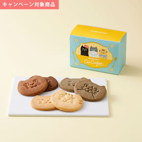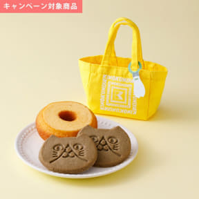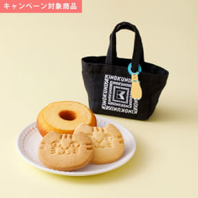 内容: ねこのチャーム付きミニバッグに、2種の焼き菓子(ねこの顔型クッキー、バウムクーヘンプレーン)を詰め合わせ。