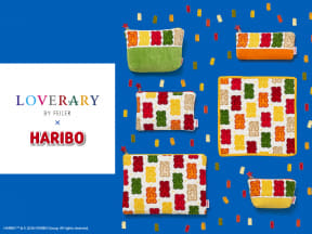 FEILER(フェイラー)が手がけるドイツ伝統のシュニール織の生地に、ハリボーの定番「ゴールドベア」のパッケージやかわいいクマの形をしたグミ6種類のフレーバーのポップな色使いを取り入れた、ハンカチやポーチ、バッグなど全10種をラインアップ。コラボだけのために制作したオリジナルデザインで世界観が楽しめるという。