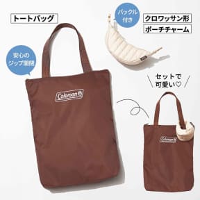 付録はアウトドアブランド「Coleman(コールマン)」のジップ付きトートバッグ&クロワッサン形ポーチチャームのセット。トートバッグは、チョコレートのようなブラウンカラーに淡いピンクのロゴを組み合わせたトレンド感のあるデザインで、サイズは約33×6×43cm(幅×奥行×高さ)。雑誌やPC、LIVEグッズもすっぽり収納できる。安心のジップ開閉で、軽くて丈夫なリップストップ生地を採用している。