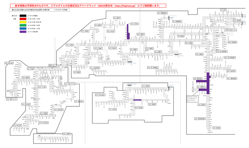 1月9日12時時点で対象に挙げているのは、近畿地方では阪和道(E42)の美原北IC~阪南IC間および堺泉北道(E90)・関空道(E71)。中国地方の米子道(E73)、四国地方の徳島道(E32)でも通行止めの可能性があるとしている。