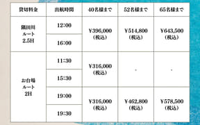 料金は出航時間・ルートにより異なり、乗合の場合は1人7900円~、貸切の場合は1艘31万6000円~。2月28日までに貸切予約すると、予約前後を問わずもう一度無料で乗船できるペアチケットと、日本酒酒場「米三角」(東京都江東区豊洲6-5-1)の3000円分食事券がもらえる。