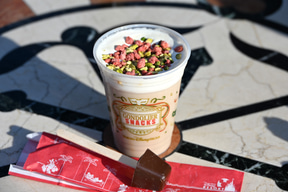 さらに、くるくるとダークチョコを回して味わえる「ピスタチオとストロベリーのカフェモカ」(850円)も販売中。カーニバルの華やかさをイメージしたドリンクで、自分好みにアレンジも。ピスタチオの食感にほどよいチョコレートの甘さがドリンクにプラスされ、ほっとできる味わいだった。
