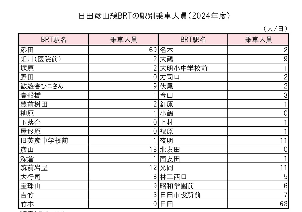 一方で、東峰村内の利用状況はどうか? 添田駅や日田駅の利用者は1日当たり60人以上いるが、東峰村の村内にある筑前岩屋、大行司、宝珠山の3駅を合計しても、利用者は30人以下にとどまる(2024年度)。