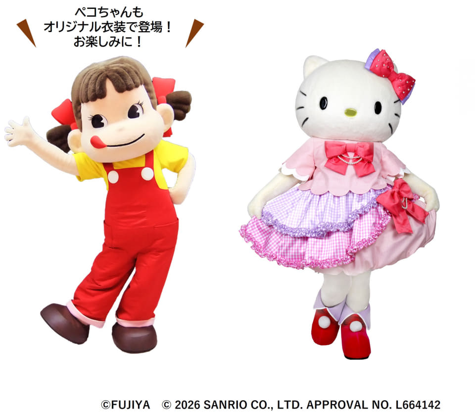 チョコレートのドレスを着たペコちゃん姫&ポコちゃん王子のパネルが出迎える会場では、謎解き企画やお菓子詰め放題を行なうほか、バレンタイン向け商品を販売。また、今回初お披露目となる「ペコちゃん×サンリオキャラクターズコラボ POPUPブース」を設置し、描き下ろしデザインのレトロかわいい新作グッズに加えて、ハローキティとペコちゃんによるグリーティングも実施する。
