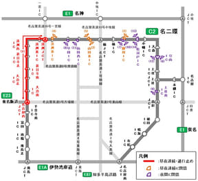 名二環の清州JCT~名古屋西JCT間(外回り)では、4月7日~16日に昼夜連続通行止めを実施。東名阪道の名古屋西IC~亀山IC間(上下線)では4月5日~24日(日曜除く)に車線規制を行なう。また、日によっては一部IC/PAを閉鎖する。