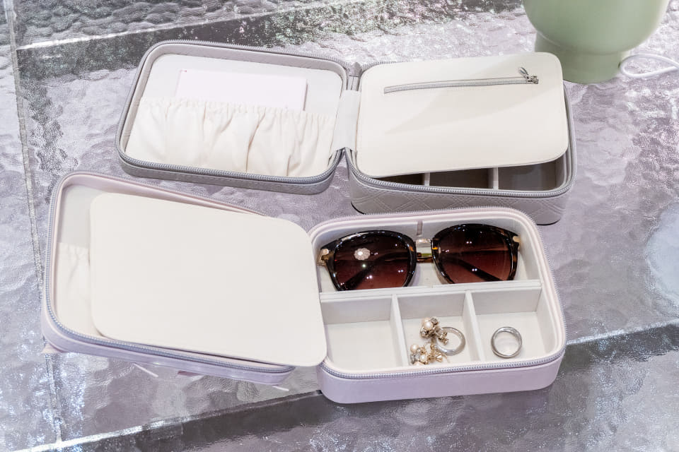 ヘアアクセや推し活でゲットした大切な小物類など、形の異なるアイテムも美しく収納できるうえ、キャリーケースにスッと収まる絶妙なサイズ感も◎。宿泊先のホテルで「貴重品を1か所にまとめておきたい」「客室のセーフティBOXに直入れするのはちょっと……」というときに重宝する。