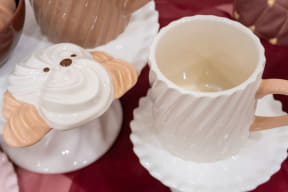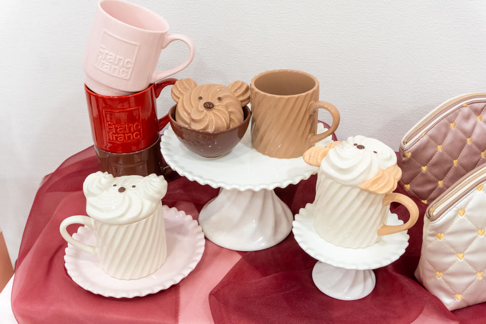 さらに、SNSで話題を集め、オンライン先行発売では即完売したというマグカップ「ホイップマグ」(2200円)もいよいよ店舗で1月16日に発売。まるでホイップクリームで作ったような動物の顔の蓋がセットになった陶器マグで、たれ耳の犬はキャラメル味、白い犬はミルク味、くまはチョコレート味をイメージしているという。