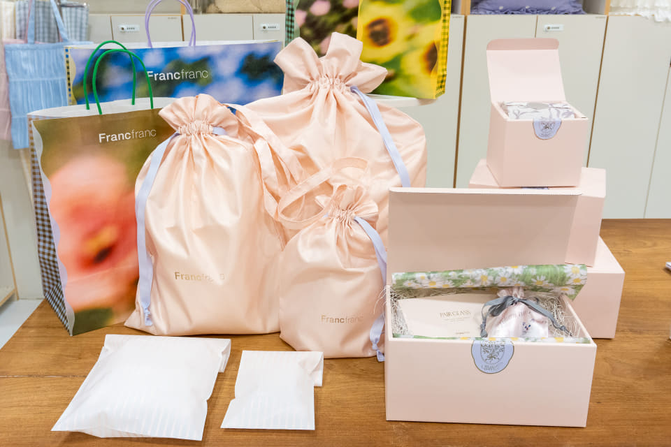 そしてFrancfrancでは、ギフトラッピングを約8年ぶりに刷新。巾着バッグタイプのラッピングは、もらった人がプレゼントを開封したあとも巾着バッグとして使えるしっかりとした生地感が特徴。価格は大中小サイズいずれも1個220円とお手頃で、旅行やお出かけの“着替えポーチ”にぴったりの質感なので、自分用にゲットするのもアリだろう。