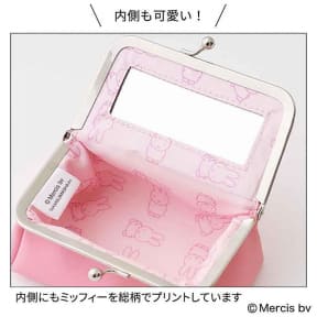 生地はミッフィープリントのピンク色のレザー調。内側にも総柄をあしらっており、リップやお直しコスメをかわいく収納できる。
