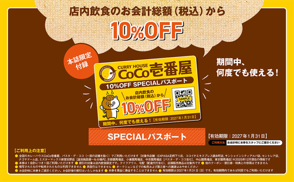 本日発売「カレーハウスCoCo壱番屋」ファンブック。期間中何度でも使える10%引きパスポート付録