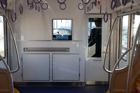 ベビーカーや車椅子などでの利用を想定して広い床スペースを確保したうえで、寄りかかりやすいように車体中心線上にS字形の衝立を設置。さらに、小さな子供でも外を見やすいように、側窓を下方に拡大して、つかまりやすいように配慮した「ロ」の字形の手すりを配している。