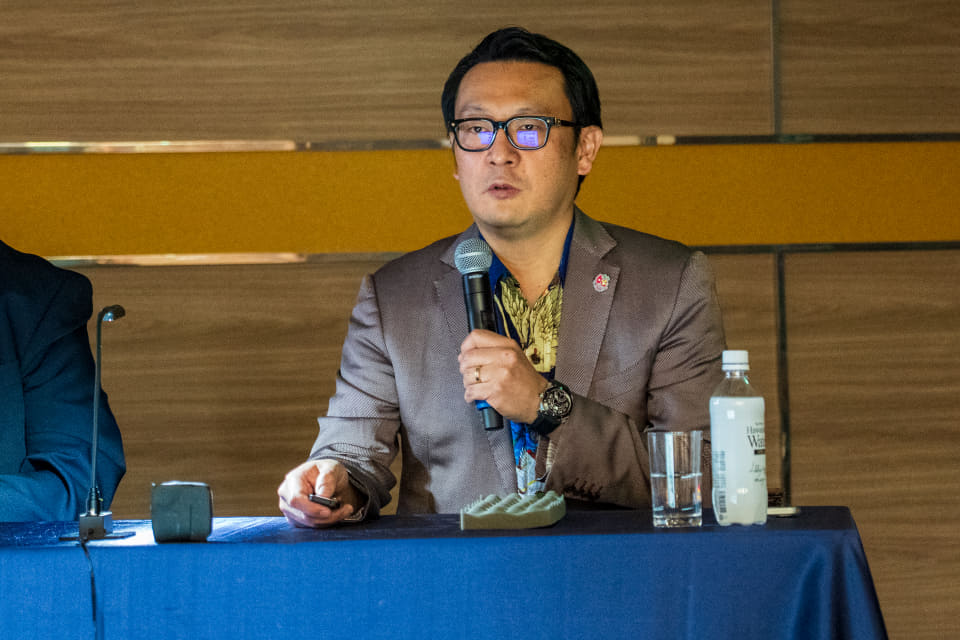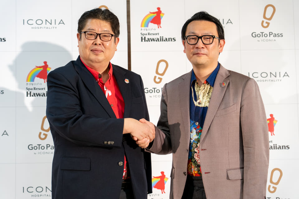 登壇したのは、アイコニア・ホスピタリティ 代表取締役会長で常磐興産の会長を務める山本俊介氏と、常磐興産 取締役社長執行役員の関根一志氏。