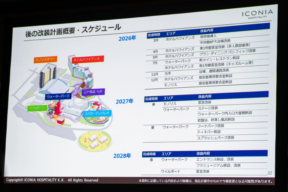 発表によると今回の大規模リニューアルは総工費110億円超を見込んでおり、改修全体テーマは「ノスタルジックなハワイと現在のハワイ」。2028年3月までに各ホテルやウォーターパーク、大浴場などで改装・新設を終える予定だ。