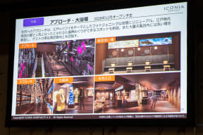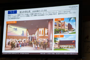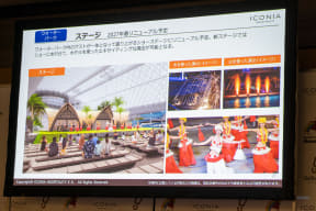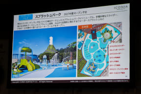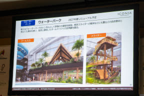ウォーターパークは、日帰りゲストの駐車場側にエントランスを移動。生体認証を導入しスムーズに入場・精算までできるようにDX化を図る。また、ウォーターパークの新たなシンボルとして茅葺の大屋根を新設。ショーステージも2027年春にリニューアルされ、水や火を使った演出が可能になるという。