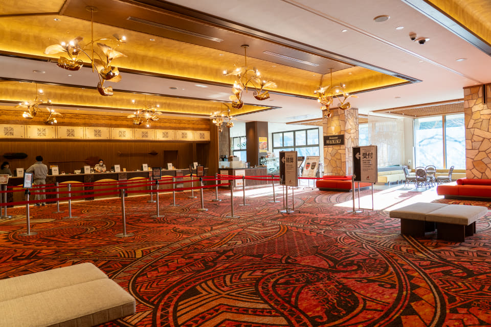 まずはホテルハワイアンズの1階ロビーだ。絨毯やチェックインカウンターにポリネシアの伝統文様デザインを取り入れるなどして一新されている。今後は自動チェックイン機や宿泊ゲストがチェックイン前に利用できる専用更衣室を新設予定とのこと。