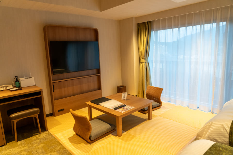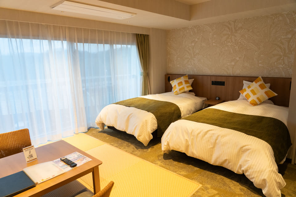 ホテルハワイアンズ東2号館の2・3階にあった和室タイプの客室は、ベッドタイプの「スーペリア和洋室」として20室リニューアル。和の温かみを残しつつ、モダンで落ち着くインテリアが特徴だ。最大4名まで利用可能。