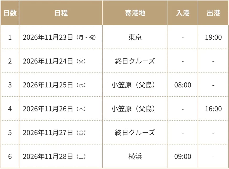 HISは、「2026年新規就航三井オーシャンサクラで航く 東京港発横浜港着 世界自然遺産小笠原クルーズ 6日間」を11月23日~28日に催行する。すでに販売を開始しており、代金は45万円~(2人1室利用時1人あたり)。