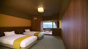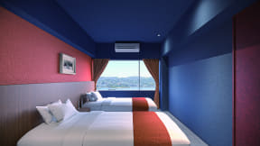 全客室は、「和色」をテーマにした和モダンな空間へとリニューアル。落ち着きのある「霞千草」、温かみのある「土山吹」、洗練された「東雲青藤」の3つのデザインを用意する。ホテルは稲佐山の中腹に位置することから、すべての客室から“長崎の1000万ドルの夜景”を一望できるという。