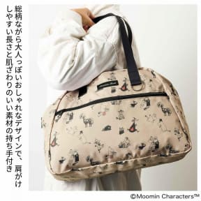 ボストンバッグは、ムーミン谷の仲間たちが大集合した総柄で、肩がけしやすい長さと肌ざわりのいい素材の持ち手付き。1泊2日の旅行の荷物もすっきり収まる大容量サイズながら、折りたたんでメッシュポーチに収納できる。